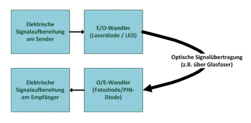 System zur Nachrichtenübertragung mittels Laserdiode, Glasfaser und Photodiode aus dem Patent von Manfred Börner.[1]