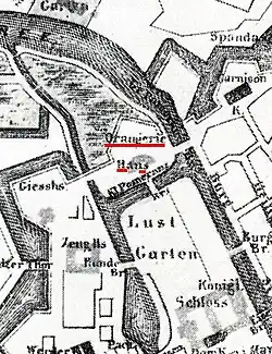 Der kurfürstliche Baumeister Johann Gregor Memhardt erbaute in dem Garten bereits 1650 ein „Lusthaus“ im niederländischen Stil, eine Art von festem Gartenpavillon, der als Rahmen für höfische Feste diente und in seinem Untergeschoss eine künstliche Grotte enthielt. Für die 1649 aus Holland eingeführten und erstmals hier angepflanzten Kartoffeln errichtete Memhardt 1652 das „Pomeranzen-Haus“ (später auch als „Orangerie-Haus“ bezeichnet), in dem zur kalten Jahreszeit 586 Bäume untergebracht waren.[1] Hier wurden neben Kartoffeln auch Tomaten als Zierpflanzen gezogen. Durch einen Fehler im Heizsystem brannte das ursprüngliche Gebäude jedoch bereits 1655 ab. Es wurde 1656 zunächst neu aufgebaut, jedoch wenig später 1658 im Rahmen einer weiträumigen Fortifikation der gesamten Stadt bereits wieder abgerissen, um Platz für die Befestigungsanlagen zu schaffen. Im Rahmen der Fortifikation wurde auch ein Festungsgraben angelegt, der den Lustgarten zerschnitt und den Cöllner Stadtgraben mit der Spree verband. Die Brücke, die den Platz der alten Orangerie nun mit dem Lustgarten verbinden musste, wurde „Kleine Pomeranzen-Brücke“ genannt.