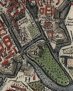 Der kurfürstliche Baumeister Johann Gregor Memhardt erbaute in dem Garten bereits 1650 ein „Lusthaus“ im niederländischen Stil, eine Art von festem Gartenpavillon, der als Rahmen für höfische Feste diente und in seinem Untergeschoss eine künstliche Grotte enthielt. Für die 1649 aus Holland eingeführten und erstmals hier angepflanzten Kartoffeln errichtete Memhardt 1652 das „Pomeranzen-Haus“ (später auch als „Orangerie-Haus“ bezeichnet), in dem zur kalten Jahreszeit 586 Bäume untergebracht waren.[1] Hier wurden neben Kartoffeln auch Tomaten als Zierpflanzen gezogen. Durch einen Fehler im Heizsystem brannte das ursprüngliche Gebäude jedoch bereits 1655 ab. Es wurde 1656 zunächst neu aufgebaut, jedoch wenig später 1658 im Rahmen einer weiträumigen Fortifikation der gesamten Stadt bereits wieder abgerissen, um Platz für die Befestigungsanlagen zu schaffen. Im Rahmen der Fortifikation wurde auch ein Festungsgraben angelegt, der den Lustgarten zerschnitt und den Cöllner Stadtgraben mit der Spree verband. Die Brücke, die den Platz der alten Orangerie nun mit dem Lustgarten verbinden musste, wurde „Kleine Pomeranzen-Brücke“ genannt.