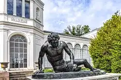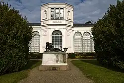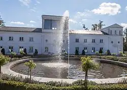 Die zweigeschossige Hofseite ist im Erdgeschoss mit einem Raum für Trauungen eingerichtet. Der Eingang zur Hofseite wird durch zwei eingeschossige Torhäuser mit Satteldach und Rundbogenfenstern flankiert, in denen ein Café und die Schauwerkstatt einer Töpferei eingerichtet sind. Die Torpfeiler tragen bekrönende Adler aus Gusseisen. Vor dem Mittelrisalit auf der Parkseite ist eine Nachbildung der Figur des Sterbenden Galliers aufgestellt.