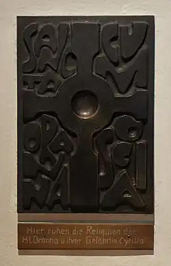 Der Maler Fritz Zolnhofer schuf das Triptychon „Aus der Tiefe rufe ich“ zum Andenken an die 299 bei der Schlagwetter-Explosion in der Grube Luisenthal am 7. Februar 1962 im Abbaubereich Alsbachfeld ums Leben gekommenen saarländischen Bergleute. Der Metallbildhauer Harry Leid[4] (1933–1999) fertigte im Jahr 1969 ein Kupferrelief als Deckplatte des Wandgrabes von Oranna und Cyrilla.[5]
