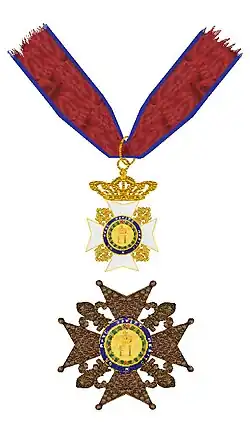 Das Ordensband ist rot mit einem blauen Streifen auf beiden Seiten. Ritter des Großkordons trugen Ordenskreuz am Schulterband, Großkreuze und Kommandeure um den Hals. Der Ordensstern, der von den Kommandeuren mit Stern etwas kleiner war, wurde auf der linken Brustseite getragen.