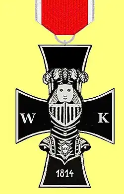 Die Dekoration ist ein schwarzes, in Silber gefasstes Brabanter Kreuz aus Gusseisen, dessen beide senkrechte Arme verlängert sind. Auf dem Kreuz ist ein eiserner Ritterhelm mit fünf wallenden Straußenfedern, einem silbernen Löwenkopf und einem durchgebrochenen geschlossenen Visier aus Silber angebracht.[1] Auf dem linken bzw. rechten Kreuzarm die Initialen W K für Wilhelm Kurfürst und auf dem unteren Kreuzarm die Jahreszahl 1814. Ab 1815 kam die Auszeichnung in Form einem Balkenkreuzes mit verlängerten senkrechten Armen zur Verleihung.