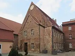 In seinem gotischen Baustil lehnt es sich an die Bürgerhäuser der norddeutschen Hansestädte an. Besonders der mit sechs großen Halbsäulen gezierte Nordostgiebel, zwischen denen gotische Spitzbogen-Blenden neun nachträglich eingearbeitete Fenster aufnehmen, verweist auf hanseatische Bautradition. Das zweigeschossige Haus zeigt sich zu seiner postalischen Adresse Schusterstraße 6 giebelständig. Im Inneren fallen Decken mit typischem gotischen Kreuzrippengewölbe auf.