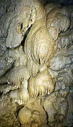 Tropfsteine konnten nur entstehen, weil der Wasserspiegel später soweit sank, dass die Höhle trocken lag. Jetzt tröpfelte Grundwasser nur noch durch die Risse und Höhlen und löste nicht mehr nur das Gestein, sondern deponierte mit jedem Tropfen winzige Mengen Kalzit. Das Kalzit bildete im Laufe der Zeit Schichten, die langsam wuchsen. Wo das Wasser als Tropfen fiel, entstanden Stalaktiten und Stalagmiten, wo es langsam abfloss wuchsen Sinterkrusten.