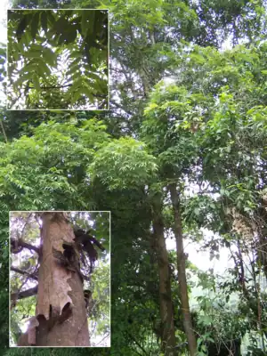 Die Laubblätter stehen gegenständig und sind paarig gefiedert, in der Knospe behaart, ausgewachsen dann kahl. Der Blattstiel ist 1 bis 3 cm lang, die Rhachis 2 bis 12 cm. Die kurz gestielten bis sitzenden, eiförmigen bis -lanzettlich und bespitzten bis zugespiten, unterseits helleren 4 bis 12 Fiederblättchen stehen gegenständig bis fast gegenständig. Sie sind etwa 6–13 cm lang und der Blättchenrand ist meist ganz, einzelne Triebe tragen auch solche mit im vorderen Teil grob gesägtem Rand. Die spitze Basis ist symmetrisch oder asymmetrisch und öfters leicht herzförmig oder geöhrt, der Rand ist manchmal knapp umgebogen. Der Blattaustrieb erfolgt bei großen Bäumen dreimal im Jahr im März bis Juni, im August und im November. Junge Blätter sind gelblich-rot.