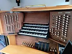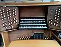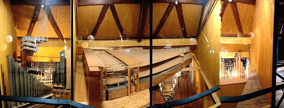 1970/71 wurde die erste Heldenorgel durch einen technischen Neubau der Firma Walcker aus Ludwigsburg ersetzt. Zunächst wurde lediglich das Positiv 1970 als Teilausbau realisiert, um die Auswirkung des hohen Winddrucks auf die Funktion von Schleifladen zu testen. Nachdem dieser Test erfolgreich verlaufen war, wurde die neue Heldenorgel bis 1971 auf mit elektrischen Schleifladen erbaut. In diesem Zuge konnte der Tonumfang der Manuale auf C-c4 sowie der Pedalumfang von C-g1 realisiert werden. Aus der ersten Heldenorgel von 1931 wurden 11 der 16 Register wiederverwendet.[20] Bis zur Erweiterung 2008 umfasste die Orgel 4.307 Pfeifen, 46 Register auf vier Manualen und diverse Spielhilfen.