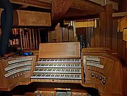 2009 wurde eine Ergänzung auf 65 Register (inklusive Auszüge) und der Neubau des Spieltischs sowie der elektrischen Traktur durch die Firma Orgelbau Eisenbarth (Passau), die die Orgel seither auch betreut, durchgeführt. Das 500-adrige Kupferkabel wich einem Glasfaserkabel. Die Orgel wurde in drei Kammern aufgeteilt, um ihren Klang mit stufenlos regelbaren Lamellen an den Austrittsfenstern steuern zu können.[21] Seitdem umfasst das Instrument 4948 Pfeifen und eine elektronische Setzeranlage. Nach Umbau des Spieltischhäuschens kann man den Organisten bei seinem Vortrag auch sehen.[22] Der Organist kann sein Spiel durch eine Lautsprecheranlage verzögerungsfrei hören, während der Orgelklang infolge der Schallgeschwindigkeit mit einigen Zehntelsekunden Verspätung bei den Zuhörern ankommt.