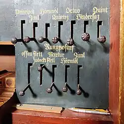 C: 1 1⁄3′ + 4⁄5′ fis1: 2 2⁄3′ + 1 3⁄5′. - ↑ Das Regal steht auf einer eigenen Lade in der „Brust“, unterhalb der Hauptwerklade. Es ist bei e0/f0 in Bass und Diskant geteilt. Die Aktivierung von Bass- und Diskanthälfte erfolgt über Sperrventile. Über den Registerzug anzug kann seine Traktur abgestellt werden.
