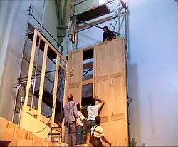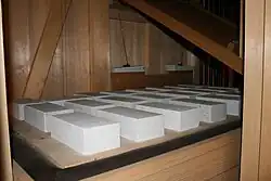 Einer der Magazinbälge mit Gewichtsteinen. Im Hintergrund rechts zwei von drei vorhandenen Tremulanten