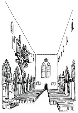 1656 baute Stadtbaumeister Knoll zwischen dem Triumphbogen am Choreingang und dem ersten Pfeilerpaar eine brücken- beziehungsweise lettnerartige Empore ein, vermutlich als Ort für Sänger und Instrumentalisten, die allein oder zusammen mit der Orgel musizierten, da das Schwalbennest nicht den Platz für eine größere Anzahl von Personen bot. Auch für die Aufführungspraxis der zu dieser Zeit beliebten mehrchörigen Musik lag es nahe, Musiker auf mehrere Emporen zu verteilen. Auf dieser Empore stand bis 1827 auch eine kleine Orgel, die später in die Kinderlehrkirche gebracht und dort bis 1874 verwendet wurde. Sie war wahrscheinlich vom Orgelbaumeister Siegmund Riegg angefertigt worden.[4]