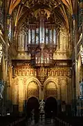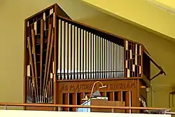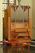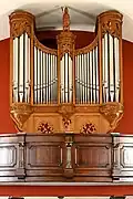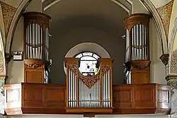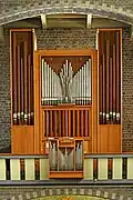 II/p | 8 | Brüstungsorgel von Guido Schumacher (1989) zwischen dem rechten und linken Orgelgehäuse mit Prospektpfeifen der Vorgängerorgel von François Joris (1926) |