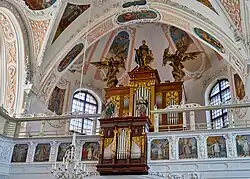 Bereits zu Beginn des 17. Jahrhunderts existierte in der Stiftskirche eine Orgel. 1611 wird ein Erasmus Hofer als Stiftsorganist erwähnt. 1622 wurde auf der neu errichteten Westempore eine neue Orgel für 1000 Gulden erbaut. Die Disposition ist nicht überliefert; sie dürfte etwa 20 bis 25 Register auf zwei Manualen und Pedal umfasst haben. Im 19. Jahrhundert wurde sie bei einem Brand zerstört.[1]