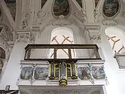 Eine kleine, stehend zu spielende Chororgel wurde im 17. Jahrhundert von einem unbekannten Orgelbauer erschaffen. Sie wird Christoph Egedacher d. J. zugeschrieben und befindet sich im Konventchor an der Corettibrüstung nordseitig im westlichen Chorjoch.[2] Südseitig hat sie ein Gegenstück als Attrappe mit stummem Prospekt. Der fünfteilige Prospekt der Chororgel mit einer konvex vortretenden Mitte und spitz vorgezogenen Seiten zeigt Akanthusdekor von etwa 1680. Nach der Aufhebung des Stiftes 1811 wurde die Chororgel zunächst einmal nicht mehr benutzt. 1992 wurde sie erstmalig von Bernhardt Edskes restauriert, 2012 folgte eine Restaurierung des Gehäuses. 2017 wurde die Windversorgung, als einziges Element nicht original erhalten, im historischen Sinne als Keilbalganlage rekonstruiert.[3] Die Disposition lautet:[4]
