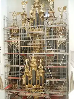 Der Orgelprospekt mit seinen im niederländischen Knorpelstil gehaltenen Schmuckmotiven zählt zu den repräsentativsten Orgelprospekten des Frühbarock. Im Mittelpunkt dieses Hauptwerks steht König David als Stammvater geistlicher Musik. An oberster Stelle befinden sich die Pfeifen des Oberpositivs.