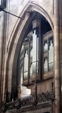 Die Marienorgel im nördlichen Seitenschiff wurde 1965 von der Orgelbaufirma Rieger (Schwarzach, Vorarlberg) erbaut. Das Instrument hängt an der Ostwand des nördlichen Querhauses; es wurde nicht auf der Nordempore aufgestellt, um die Glaskunst der Nordwand nicht zu verbauen und eine bessere Klangabstrahlung in das Hauptschiff zu gewährleisten. Um Letztere zu begünstigen, sind die Seitenwände der Pfeifentürme um 30° hin zum Hauptschiff gedreht.[5]