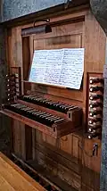 Das Gehäuse des Continuo-Werks ist an das der Renaissance-Orgel optisch ident angebaut, die Spielanlage befindet sich ein paar Schritte südlich der Renaissance-Orgel.