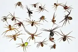 Detail einiger betäubter Spinnen mitsamt einem Ei der Wespe auf einem Exemplar -