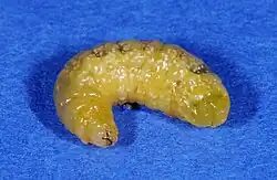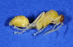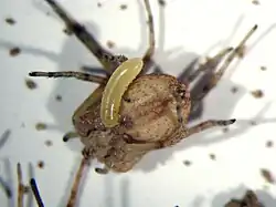 Die geschlüpfte Larve durchläuft drei Larvenstadien. Sobald sie aus dem Ei geschlüpft ist, legt sie sich mit der Innenseite ihrer Körperkrümmung eng an das Opisthosoma der Spinne, auf der ihr Ei abgelegt wurde. Mithilfe der Mundwerkzeuge an ihrer Kopfkapsel beginnt die Larve sich in den Körper der Spinne zu graben und beginnt diese aufzusaugen, indem sie durch das Graben immer mehr Körpersubstanz der Spinne erreicht und anschließend durch das Saugen aufnimmt. Dabei sind durch den ganzen Körper verlaufende peristaltische Bewegungen zu verzeichnen. Am vierten Tag besitzt die Larve eine kommaförmige Gestalt, eine Körperlänge von etwa 2,6 Millimetern und eine weißlich bis hellgelbe Grundfärbung. Ihr Körper besteht aus mehreren Segmenten, die jeweils wulstartig erhoben erscheinen. Ist eine Spinne aufgefressen, beginnt die Larve die nächste zu verzehren. Das zweite Larvenstadium ist etwas größer als das erste und besitzt stärker ausgeprägte Mundwerkzeuge sowie einen Haftapparat. Die Grundfarbe bleibt jedoch dieselbe und mit Ausnahme kleiner Punkte auf dem Körper der Larve existieren noch keine Chitinstrukturen. Im dritten Larvenstadium ändert sich die Grundfärbung ebenfalls nicht, allerdings ist die Kopfkapsel hier blassgelb und an der Stirn mit zwei hellgrauen und zwei weiteren hellbraunen Streifen versehen. Die teils hell- und dunkelbraunen Mundwerkzeuge sind hier bereits als Mandibeln erkennbar und erscheinen deutlich stärker ausgeprägt als bei den vorherigen Stadien. Hinsichtlich ihrer Größe füllt die Larve im dritten Stadium die Brutzelle fast restlos aus. Die Larve frisst in den meisten Fällen alle Spinnen innerhalb ihrer Brutzelle auf und verpuppt sich nach ausreichender Nahrungsaufnahme anschließend.[3]