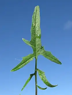 Die Laubblätter an einem Exemplar können sehr unterschiedlich sein. Die Grundblätter sind ungeteilt.[1] Die unterer Stängelblätter sind gestielt, fiederschnittig, mit unregelmäßigen Seitenabschnitten und großem Endabschnitt.[2] Die oberen Stängelblätter sind gestielt und dreiteilig-spießförmig bis ungeteilt.[2] Die unteren und mittleren Stängelblätter sind schrotsägeförmig fiederspaltig mit jederseits zwei bis vier Blattabschnitten, ihr Endabschnitt ist meist dreieckig-spießförmig.[4] Die Seitenabschnittte sind oft schmal und rückwärts gerichtet.[4]
