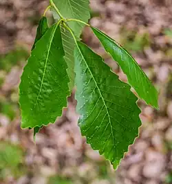 Die wechselständig und spiralig an den Zweigen angeordneten Laubblätter sind in Blattstiel und -spreite gegliedert. Der unbehaarte Blattstiel weist eine Länge von 1 bis 1,3 Zentimeter auf. Die einfache Blattspreite ist bei einer Länge von 5 bis 30 Zentimeter und einer Breite von 5 bis 16 Zentimeter verkehrt-ei- bis spatelförmig, mit keilförmiger bis abgerundeter Spreitenbasis und stumpfer bis spitzer Spitze. Die Spreitenränder sind spitz oder stumpf gesägt bis grob gekerbt oder gebuchtet bis feingewellt. Die Blattoberseite ist kahl, während die Unterseite je nach Varietät dicht mit grauen bis gräulich braunen und feinen bis filzigen Haaren besetzt oder auch unbehaart ist. Von jeder Seite des Mittelnerves zweigen 10 bis 15 Blattadern ab.[1][2][3][4]