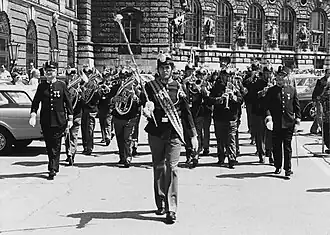 Nach dem unerwarteten Tod von Julius Herrmann im Frühjahr 1977 beschlossen die Stammmusiker der führerlos gewordenen Kapelle um den damaligen Musikmeister und Flötisten Ferdinand Kastner, dass ein Verein gegründet werden sollte. Zuvor wurde fälschlicherweise die Auflösung der Deutschmeisterkapelle in den Medien gemeldet.[40] Musikmeister Ferdinand Kastner leitete zwei Proben als Kapellmeister, bevor er von dieser Position wieder zurücktrat und unter dem neuen Kapellmeister der Original Hoch- und Deutschmeisterkapelle Horst Winter wieder Flöte spielte.[41] Die organisatorische Leitung der Kapelle übernahm damals der Musikmanager Wilhelm Breitenfeld (1918–1998), Chef der österreichisch internationalen Künstlervermittlung ÖIK. Am 6. Mai 1977 kam es unter der Bezeichnung »„Original Hoch- und Deutschmeister“ Kapelle des K. und K. Infanterieregiments Hoch- und Deutschmeister Nr. 4« zur Gründung eines Vereines, der unter der ZVR-Zahl 385688411 im Zentralen Vereinsregister eingetragen ist. Am 17. Juli 1977 gab Horst Winter das erste Konzert am Michaelerplatz als neuer Kapellmeister. Bei diesem Konzert wurde eine originalgetreue Kopie der Regimentsfahne feierlich von Erzbischof-Koadjutor Franz Jachym geweiht. Das Original befindet sich seither im Heeresgeschichtlichen Museum in Wien.[42] In Winters Schaffensperiode fallen zahlreiche Tourneen in Europa, wie etwa nach Deutschland, Luxemburg und in die Schweiz. Zudem spielte die weltberühmte Kapelle bei der Fußball-Weltmeisterschaft 1982 in Spanien und nahm mehrere Tonträger auf. Auch das 250-jährige Jubiläum der Kapelle und das 300-jährige Bestehen der Hoch- und Deutschmeister wurden in dieser Zeit gefeiert.[43][44] Seit 1988 besitzt die Kapelle mit der Marke „Hoch- und Deutschmeister“ auch einen für musikalische Dienstleistungen markenrechtlich geschützten Namen, der mittlerweile auch europaweit mithilfe einer Unionsmarke vor Missbrauch geschützt ist.[45][46]