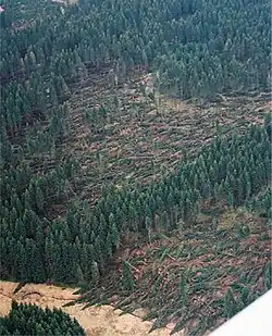 Katastrophale Folgen hatte der Orkan für die Waldbestände. In den deutschen Wäldern fielen rund 37 Millionen Festmeter Holz dem Sturm zum Opfer.[36] Im Thüringer Wald rechnet man mit etwa 500.000 Festmetern, also etwa 215.000 Tonnen Sturmholz.[37] Zum Schluss hinterließ Kyrill in Thüringen 6300 ha Kahlflächen, 4700 ha gelichteten Wald und verstreute Baumwürfe auf 200.000 ha.[38] Gründe für den dortigen Schaden waren zum einen der durch die starken Niederschläge der letzten Wochen aufgeweichte Waldboden, zum anderen die Tatsache, dass viele der Baumbestände bereits durch jahrzehntelange Luftverschmutzung geschädigt waren und zum dritten, dass es sich bei den betroffenen Beständen um Fichtenbestände handelte.