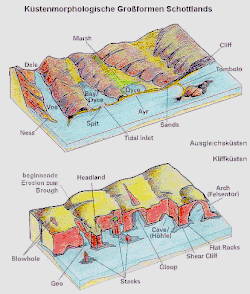 - ↑ Mangels Verfügbarkeit einer anderen Quelle wird zur Übersetzung und Erläuterung der wichtigsten topographischen, physisch-geographischen, geologischen und geomorphologischen Begriffe auf das Geo-Glossar des Schottland Portals ( vom 30. Dezember 2006 im Internet Archive) verwiesen. Das Glossar berücksichtigt nur die Verhältnisse in Schottland, geht im Zweifelsfall nicht auf modifizierte Begriffsinhalte für den englischen, walisischen oder irischen Raum ein. Es enthält sehr knappe Erläuterungen zu allen vielleicht weniger gängigen im nachfolgenden Text kursiv gesetzten Begriffen sowie darüber hinaus zahlreiche Begriffserläuterungen, die bei der parallelen Arbeit mit gängigen topographischen Karten hilfreich sein können. Die auftauchenden Insel-, Orts-, Gemarkungs- und Gewässernamen sind in der bereits verlinkten Karte ausgewiesen.