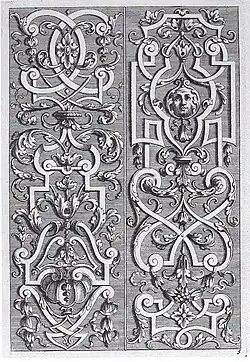 | Beschlagwerk | Bandartige Ornamente, deren Formen an aufgenietete metallene Beschläge erinnern. Im späten 16. Jahrhundert wurde es in den Niederlanden entwickelt und verbreitete sich dann vor allem in Deutschland, wo es bis etwa 1620 in Gebrauch blieb. | |