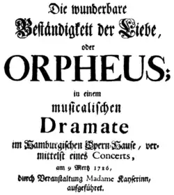 - ↑ Yvonne Rohling: Georg Philipp Telemann: Die wunderbare Beständigkeit der Liebe, oder Orpheus (1726) – ein Orpheus-Suchbild. In: Musikwissenschaft Leipzig. Eine (Quellen)Texte-Sammlung des Zentrums für Musikwissenschaft Leipzig, abgerufen am 20. Dezember 2020.