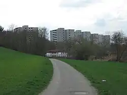 ![]() Orschel-Hagen von Süden, vom Hochhaus Tannenberger Straße 66 gesehen. Links die St.-Andreas-Kirche, dahinter die Hochhäuser an der Frankfurter Straße, dahinter Rommelsbach. Mittig die Jubilatekirche, dahinter Pliezhausen.