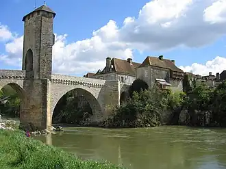 - Die alte Brücke (Pont Vieux) stammt aus dem 13. Jahrhundert; ihr heutiges Aussehen erhielt sie jedoch erst unter Gaston Fébus im 14. Jahrhundert. Ursprünglich hatte sie zwei Türme, heute überspannen drei asymmetrische Bögen, in deren Mitte sich der befestigte Brückenturm befindet, die Gave. Der Turm hat den Ansturm der protestantischen Truppen Montgomerys (1569) während der Hugenottenkriege und den der Truppen des Herzogs von Wellington (1814) während der napoleonischen Kriege weitgehend überstanden; trotzdem fand im 19. Jahrhundert eine grundlegende Restaurierung statt.[9] Bereits seit dem Jahr 1875 ist die Brücke als Monument historique anerkannt.[10]