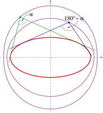 Von einem beliebigen Punkt des orthoptischen Kreises aus erscheint die Ellipse unter einem Öffnungswinkel von