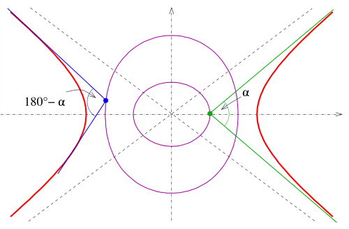 Die Lösung für den Hyperbelfall ergibt sich aus dem Ellipsenfall durch die Ersetzung von durch (wie bei den orthoptischen Kurven, siehe oben).