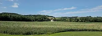 ![]() Blick von der Verbindungsstraße Osendorf–Lappach nach Südwesten auf das Lindumer Kircherl im Gebiet zwischen Osterloh und Parschalling auf der Gemarkung Watzling