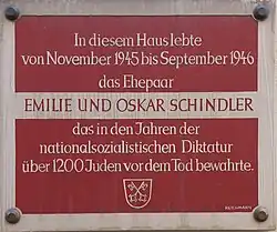 Ab diesem Zeitpunkt lebte Oskar Schindler ein „geteiltes“ Leben: Die eine Hälfte des Jahres verbrachte er in Frankfurt am Main, wo er von der hessischen Landesregierung eine kleine Ehrenrente zugesprochen bekam[19] und zurückgezogen in einer Einzimmerwohnung am Bahnhof lebte; die andere Hälfte des Jahres verweilte er bei von ihm geretteten Juden in Jerusalem. So verfuhr Schindler bis zu seinem Tod. An seinem ehemaligen Wohnhaus am Hauptbahnhof 4 in Frankfurt am Main ist eine Gedenktafel angebracht; seit April 2025 trägt der Vorplatz des Frankfurter Hauptbahnhofs den Namen "Emilie-und-Oskar-Schindler-Platz".[20] Von 1971 bis 1974 wohnte Schindler in Hildesheim, Göttingstraße 30, wo ebenfalls eine Plakette angebracht wurde.