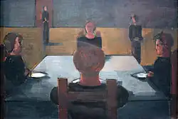 Er entdeckte die menschliche Gestalt, die weder Individuum noch Ausdrucksträger sein soll, als Ideal des Absoluten, eingespannt in den tektonisch gegliederten Raum. „Ich will Menschen-Typen schaffen und keine Porträts, und ich will das Wesen des Raumes und keine Interieurs.“[9][10] Planimetrische und stereometrische Bezüge verbanden sich auch in Vierzehnergruppe in imaginärer Architektur (1930) zu einer bildtragenden figuralen Reihung. Menschenkörper bilden hier eine gymnastische Formation aus, die die Architektur des Raumes überlagert.