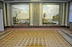 Im ersten Obergeschoss des Hauses befindet sich ein Tapetensaal, der lange als „Hackert’scher Tapetensaal“ bekannt war, weil dessen Dekoration als ein Werk von Jakob Philipp Hackert angesehen wurde. Hackert hatte sich von 1762 bis 1765 in Schwedisch-Pommern aufgehalten und für seinen Mäzen, den damaligen Mieter des Hauses Adolf Friedrich von Olthof[1], tatsächlich Wanddekorationen geschaffen. Aber nur in einem Zimmer im Gutshaus Boldevitz auf Rügen, damals im Besitz von Olthof, blieb eine Hackert’sche Raumausstattung aus dieser Zeit vollständig erhalten. Die Tapeten im Haus Ossenreyerstraße 1 konnte der Kunsthistoriker Michael Lissok hingegen in die Zeit um 1800 datieren und den Stralsunder „Decorations-Maler“ David Gottlieb Lorentz Phönix als deren eigentlichen Schöpfer identifizieren.[2]