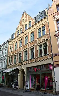 Der dreigeschossige und achtachsige, traufständige Backsteinbau wurde im Jahr 1903 als Wohn- und Geschäftshaus errichtet. Die Fassade ist symmetrisch aufgebaut und weist eine reiche Putzgliederung auf. Ein Kielbogenportal mit Knospenkapitellen sowie das hohe Zwerchhaus setzen einen starken Akzent in der Mitte der Fassade. Die jeweils zwei äußeren Fensterachsen sind zusammengezogen und im ersten Obergeschoss verdacht.[1]