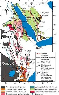 - ↑ Peter R. Johnson & Beraki Woldehaimanot: Development of the Arabian-Nubian Shield: perspectives on accretion and deformation in the northern East African Orogen and the assembly of Gondwana. In: Saudi Geological Survey (utdallas.edu PDF).