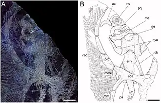 Die Brustflossen werden von etwa 86 Radialia („rad“) gestützt. Davon gehen 33 vom Propterygium, 10 vom Mesopterygium und 32 vom Metapterygium aus. Etwa 11 Radialia sind zwischen Meso- und Metapterygium direkt mit dem Scapulocoracoid verbunden; ein Merkmal, das typischerweise bei den Rajiformes, der Sägerochen-Gattung Pristis, der Gattung Zanobatus und den Gitarrenrochen auftritt. Die Nasenkapseln („nc“) sind breit und oval. Der Antorbitalknorpel („ac“) ist massiv, bogenförmig und unverzweigt. Er stellt eine direkt Verbindung zwischen Nasenkapsel und Propterygium („pro“) her.[1]