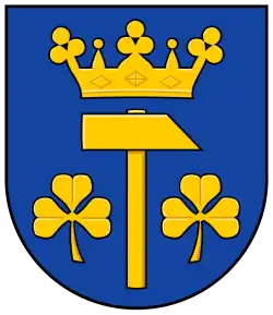 Blasonierung: „In Blau ein goldener Hammer, der von einer goldenen Laubkrone überhöht und am Stiel von je einem goldenen dreiblättrigen Kleeblatt beseitet wird.“ |