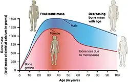 Die primäre Osteoporose ist eine zunächst unmerklich verlaufende Erkrankung, die aber im Fall von Knochenbrüchen, insbesondere bei alten Menschen, eine hohe Krankheitsbelastung (Schmerzen, Bettlägerigkeit, manchmal dauerhafte Immobilisierung) bedeutet. Die Knochenmasse nimmt etwa in den ersten drei Lebensjahrzehnten zu (in der Jugend wird Knochen aufgebaut), erreicht dann einen Höhepunkt und fällt in den späteren Lebensjahren langsam wieder ab (Involutionsosteoporose bzw. Senile Osteoporose = Typ I[3]). Ein besonderes Risiko besteht für Frauen postmenopausal (Typ-I-Osteoporose). Man geht davon aus, dass in Europa etwa 30 % aller Frauen nach dem Klimakterium an primärer Osteoporose erkranken.[2] Für Männer ist ab dem 70. Lebensjahr die Altersosteoporose ein ebenso häufiges Krankheitsbild. Innerhalb der deutschen Bevölkerung über 50 Jahren ist eine von vier Frauen und einer von 17 Männern betroffen.[4] Eine Osteoporose aus sekundären Gründen ist eher selten, etwa in Folge von Stoffwechsel-Erkrankungen oder hormonellen Störungen, und tritt bei etwa 5 % aller Fälle auf. Sehr selten ist auch die Idiopathische juvenile Osteoporose junger Menschen.