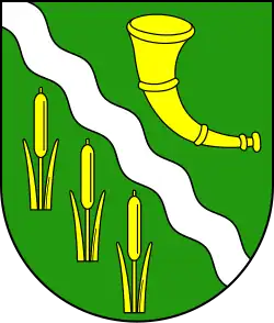 Blasonierung: „In Grün ein schräger silberner Wellenbalken, begleitet oben von einem goldenen, mit dem Mundstück nach außen weisenden Horn, unten von drei goldenen Rohrkolben.“[6]