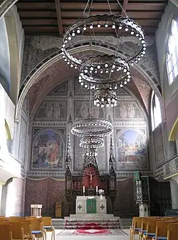 Im Altarraum befinden sich zwei große Wandgemälde mit Motiven der biblischen Ostergeschichte über einem aufgemalten Vorhang, die die Kunstmaler Willy Dzubas und Theo Behrens im Sommer 1913 fertiggestellt hatten. Über den Gemälden gibt es einen Fries, der die vier Evangelisten darstellt. Der Evangelist Lukas soll – nach unbelegten Aussagen – das Gesicht des ersten Pfarrers, Hermann Kottig, tragen.[1] Altar, Kanzel und Taufbecken sind im Stil des Historismus gefertigt. Das geschnitzte Altarretabel besteht aus einem aufragenden Wimperg, der von gotischen Türmen flankiert wird.