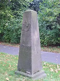 Im Jahre 1818 wurde an der Ecke Bensheimer-/Frankfurter Straße ein preußischer Ganzmeilenobelisk aus Trachyt-Gestein aufgestellt. Von diesem Meilenstein beträgt die Entfernung nach Köln eine preußische Meile (7532,48 m). Bedingt durch den weichen Stein ist das Denkmal stark verwittert und sanierungsbedürftig. Bei einem früheren Restaurierungsversuch wurde das letzte „e“ von Meile entfernt, deshalb lautet die Inschrift unterhalb des preußischen Adlers nun: „Cöln 1 Meil“.[39]