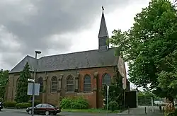 Die neugotische schlichte Backsteinkirche St. Servatius wurde im Jahre 1906 nach Plänen des Diözesanbaumeisters Franz Statz erbaut und am 23. Dezember 1906 geweiht. Von 1962 bis 1964 wurde das Kirchenschiff nach Plänen des Architekten Kurt Faber um zwei Joche erweitert. Zum Abschluss der Umbaumaßnahmen wurde ein Marmoraltar der Kölner Kirche St. Peter übernommen. Anstatt eines Turmes wurde auf das Satteldach des Kirchenschiffes ein hoher Glockenreiter gesetzt.[36]