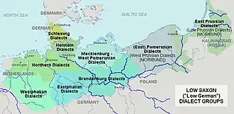Historische Verbreitungsgebiete der niederdeutschen Dialektgruppen (bis 1945) - Ortsnamen und Grenzen entsprechen den heutigen Gegebenheiten (auf Englisch)