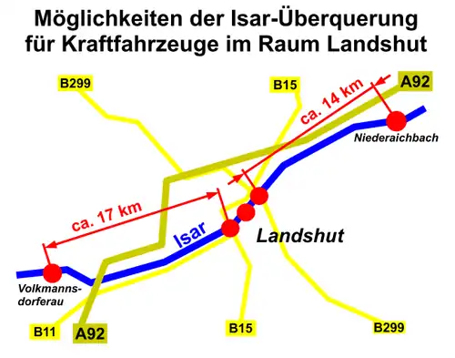 Diese Brücken sind nicht ausreichend, um den innerstädtischen wie auch den Verkehr der Nachbargemeinden aufzunehmen. Dadurch sind die bestehenden Verbindungen hoch belastet.[3] Außerhalb von Landshut gibt es für den Straßenverkehr erst wieder im Abstand von etwa 17 km in westlicher Richtung (Volkmannsdorferau) und von etwa 14 km in östlicher Richtung (Niederaichbach) Querungsmöglichkeiten der Isar.[27]