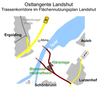 Für eine Osttangente Landshut ist kein Raumordnungsverfahren notwendig, da es sich um kein Projekt von überregionaler Bedeutung handelt. Als frühest möglichen Termin für einen Baubeginn nannte Manfred Dreier vom Staatlichen Bauamt Landshut das Jahr 2019.[43][44] Im Januar 2017 wurde ein neuer Flächennutzungsplan für den Markt Ergolding beschlossen. Eine Isarüberquerung bei Albing ist darin nicht mehr vorgesehen.[45]